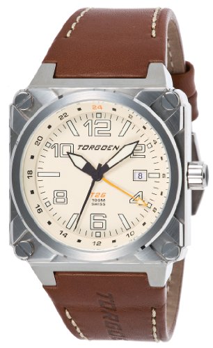 Torgoen Swiss T26 GMT SS Aviation Watch T26103 A 316L stainless steel case define this high-performance timepiece from Torgoen. With its ability to track two time zones at once, the Swiss Men's Computer Zulu Quartz Watch is ideal for aviation pilots and frequent travelers. Framed by a unique, square stainless steel case with screw details, the large, round dial features luminescent hands and hour markers, a convenient date display at three o'clock, and a 24-hour clock with a separate hour hand. With a smooth, black leather strap with contrast stitching, this precision instrument is water resistant to 330 feet (100 meters). 24 hour additional hand for dual time military format High Grade Stainless Steel case Mineral Crystal with Anti Glare Coating Italian Leather Strap with Heavy Duty Stainless Steel Buckle Swiss Quartz with 24 hours Dual Time hand Movement by Ronda. Water Resistant for 10 ATM (330 feet). Non Radioactive long lasting Luminescence Indexes and hands Weight - 4.5 oz. (128 gm) Case Dimension (w/o crowns and pushers) – 44x44mm (1 3/4”) Case Thickness – 12mm (1/2”) Crystal Diameter – 36mm (1 7/16”)