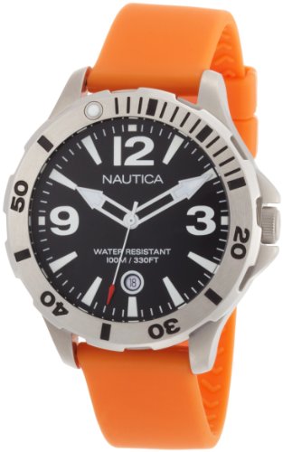 Get three looks with the Nautica Men's Diver Box Set Watch, which features three interchangeable straps in orange silicone, black leather, and gray polyurethane. The black watch face features bold white Arabic numerals in the three, nine, and twelve o'clock positions, and white indices for hour and minute markings. Other features include a date window at the six o'clock, a stainless steel case and bezel, and scratch-resistant mineral crystal. This watch relies on Japanese quartz movement with water resistance up to 330 feet (100 meters). It comes with a watch tool and a navy blue box for keeping your bands organized.