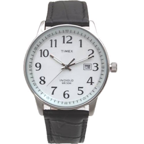 Timex 2G081 Men's Round Silver-Tone Casual Watch --- White Easy-to-Read Dial --- Black Genuine Leather Band with Silver-Tone Buckle --- Black Hour Markers --- Silver-Tone Hour and Minute Hands with Luminescent Insert -- Silver-Tone Second Hand --- Indiglo Night Light --- Date Display with Easy-to-Set Feature --- Water Resistant to 50 Meters.