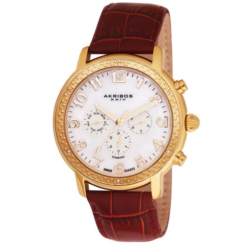 This Akribos XXIV men's Swiss quartz watch features a day and date display with an amply padded brown genuine calfskin leather strap. Highly polished beveled gold-tone stainless steel case with white mother of pearl dial and twelve diamonds on the bezel completes the look of this watch.