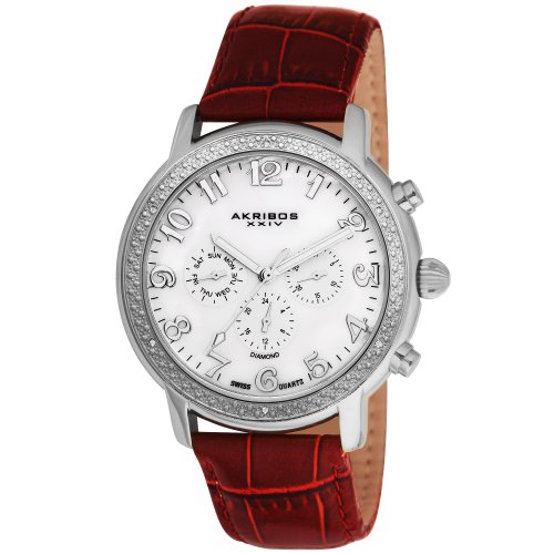 This Akribos XXIV men's Swiss quartz watch features a day and date display with an amply padded brown genuine calfskin leather strap. Highly polished beveled stainless steel case with white mother of pearl dial and twelve diamonds on the bezel completes the look of this watch.